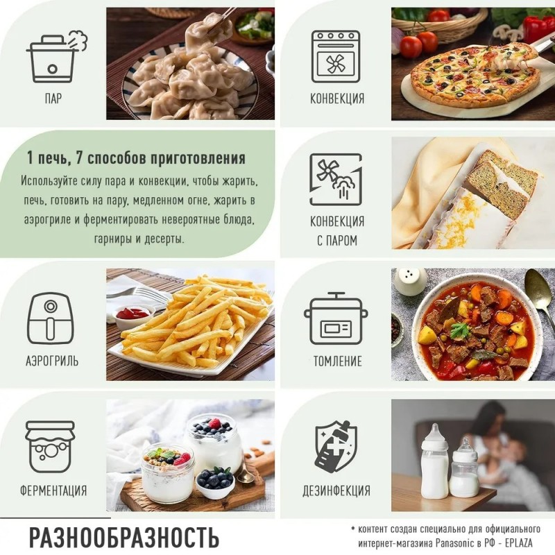 Всего одна печь позволит вам готовить, как настоящий профессионал. В дополнение к разогреву паром, печь можно использовать для выпечки, парообработки, варки компота, тушения и ферментации.